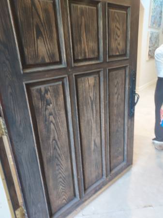 TALL WOOD HOUSE DOOR ,HIGH QUALTY DOOR FROM HIGH CLASS HOUSE (11 FEET WIDE X 5.8 FEET WIDE) VERY CLEAN , ABSOULTLY FUNCTIONAL , CLOCK & HANDEL WITH FRAME , MUST SELL CALL FOR INFO show contact info