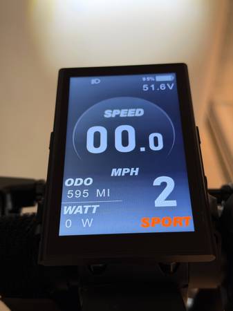 Indicator display showing speed, drive mode/gear, headlights, indicator lights, range, battery percentage and watt usage. It is also customizable through settings.