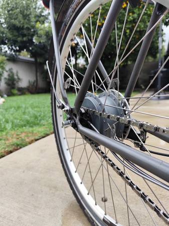 The bike comes with a rain cover and all of the original parts required to convert it back to pedal-only mode. The battery is newer and has very good range. A comfortable cruising speed is about 15mph.