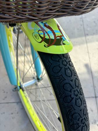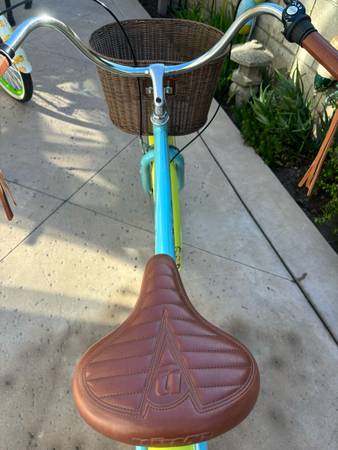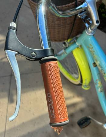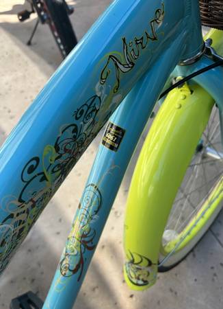 The Nirve Brand Women’s Beach Cruiser - handmade 6061 aluminum frame, designed in Huntington Beach, 26” cruiser tires, full length fenders, Nexus 3 speed twist throttle, coaster and front brakes, aluminum cranks, brown leather comfort saddle, matching leather grips and tassels, and brown wicker front basket. Rare Bike that was barely ridden and in perfect condition.