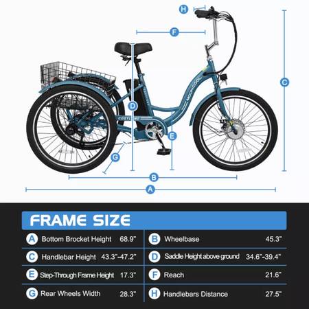 MOPHOTO Electric Tricycle has three driving modes: electric & power assist & pedal. The different options electric trike will make you enjoy riding and exercising. The electric vehicle is equipped with a 350w motor, with a maximum speed of 16km/h. The detachable 36V 10Ah lithium battery can be fully charged within 5-6 hours. The electric tricycle bike's pure electric range is about 20 miles. The battery and bike are shipped separately, so you will receive two packages. The total vehicle weight of cruiser electric tricycle is about 69.4lbs, which suitable for 5'4" to 6'1" height and 110~350lbs weight. The 3 wheel electric bicycle is 24 inch, and the basket of electric mountain tricycle is 13*17 inch. You will get a spacious space for pet cages or more types of cargo when you feld the integrated folding basket. And the seat of electric tricycle can be removed on proper position to meet your height.