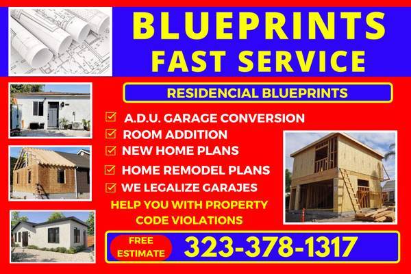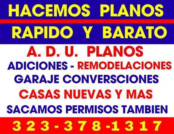 HACEMOS TODO TIPO DE PLANOS RAPIDO Y BARATO. RESIDENCIAL Y COMERCIAL.PLANOS PARA ADU GARAJES - CASAS NUEVAS/ ADICIONES/QUARTOS/ BANOS/REMODELACIONES/LEGALIZAMOS GARAJES RAPIDO. SACAMOS PERMISOS CON LA CUIDAD TAMBIEN.