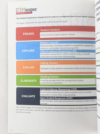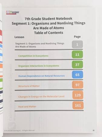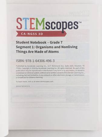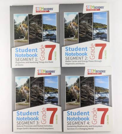 STEMscopes student notebooks for grade 7, segments 1 - 4. For California curriculum, published in 2018. In very good condition with some minor wear on the covers. Pages have no writing, markings or...