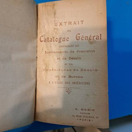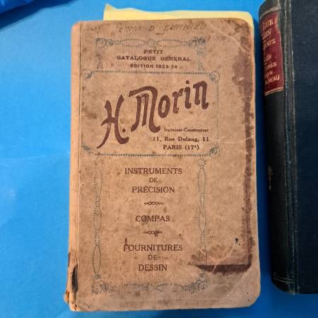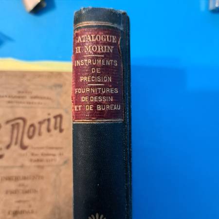 Two antiquarian French catalogues of scientific instruments by H. Morin, Paris. The 1919 edition is in hardcover with marble boards, 576 pages with end page indicating Feb. 1919. The full title of this edition is:'Catalogue H. Morin Instruments de Precision Fournitures de Dessin et de Bureau. The second catalogue, paper covers, "Petit Catalogue General Edition 1923-24, H. Morin. Instruments de Precision, Compas, Fournitures de Dessin", 512 pages, not including index. Numerous illustrations of scientific instruments. Condition: Fair as there are some tears in the 1923 cover. This was owned by an engineer who collected scientific instruments (and spoke/read French). Cash only