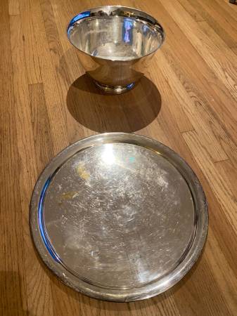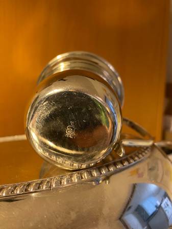 Antique Silver Punch Bowl from 1950's. It measures `13" across and 7" deep. The silver tray is 18" across. There are 30 Silver mugs. Everything is in EXCELLENT condition. There is a Hallmark : ITALY...