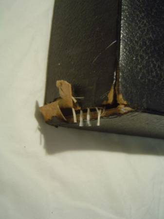 Bible itself has black leather(?) or leatherette(?) covered boards with gold gilt lettering and design on the front, back and spine. There is a light smudge on the front cover.
