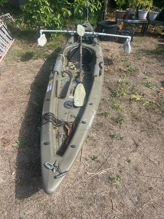 Fishing kayak with homemade out riggers, paddle, and rolling dollie. Got from a friend but never used. Thanks for looking.