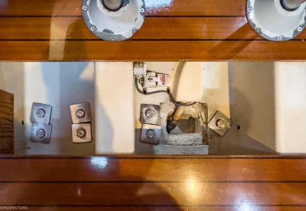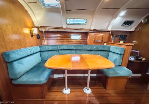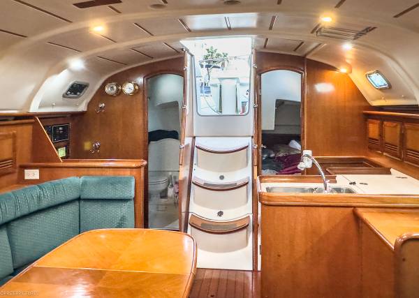 Below deck, the warm cherry interior and generous natural light create an inviting living space. The aft cabin is to port with a large double berth and ample storage. The head is located aft to starboard, just behind the navigation station, with access from the main salon. Forward, the V-berth provides a private stateroom with a hanging locker and cabinet space.