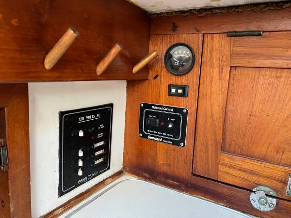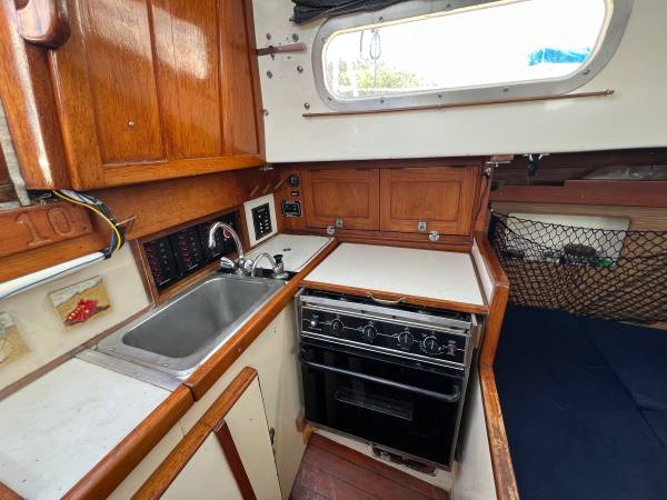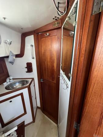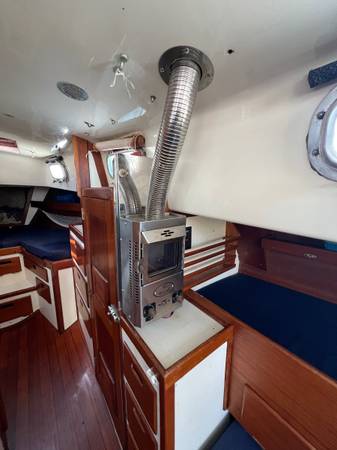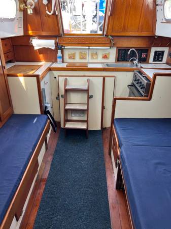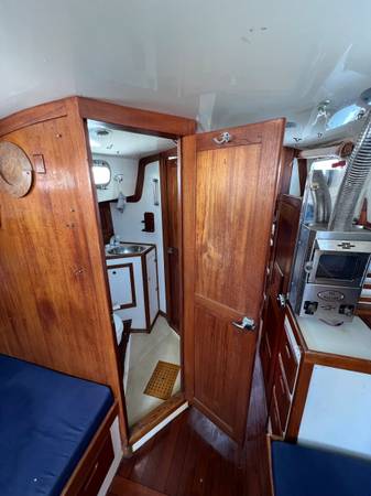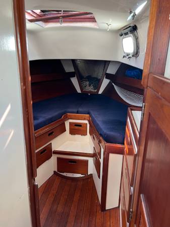 Her roomy interior has plenty of ports that open for great ventilation and light. She has a double entry spacious bathroom, private forward cabin, foldout dinning table seats 8 and drops down to a double birth, and opposite side midship single bunk and bench seating. She sleeps 5 and offers tons of storage and has a few hanging closets and lots of drawers. The hard wood cabinetry and flooring is very high quality.