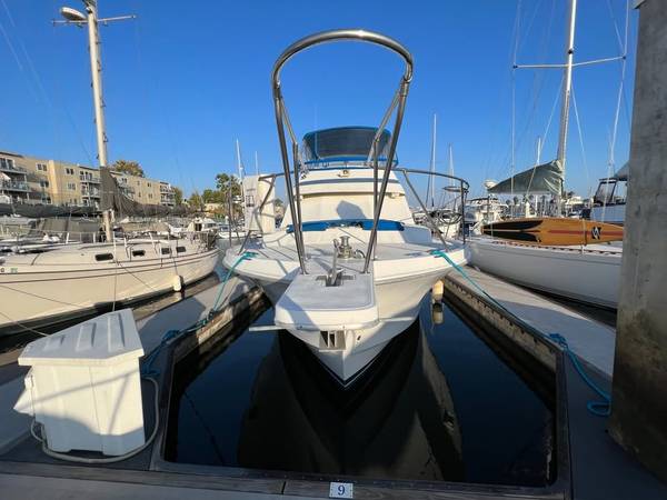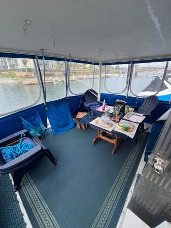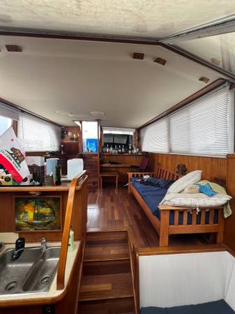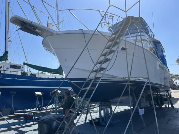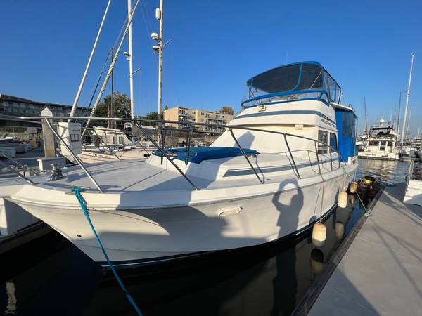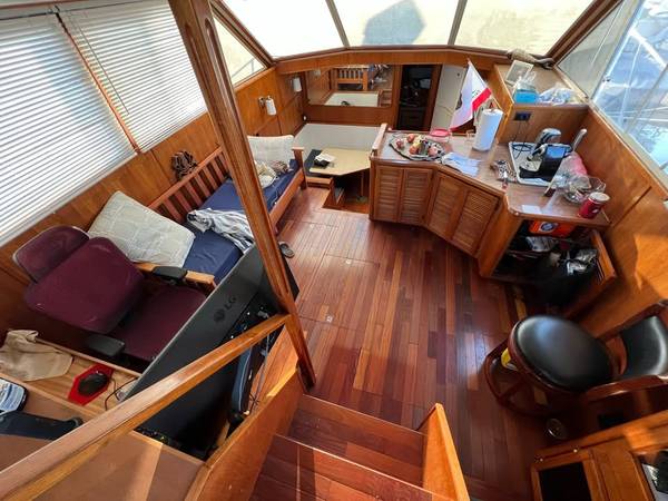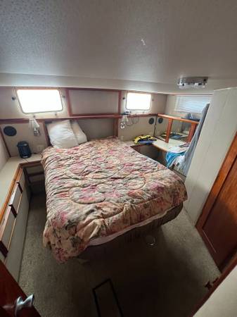 1985 Chris-Craft 42 Catalina – Spacious, solid, and comfortable. Twin rebuilt 454s for reliable cruising.. Both motors have been recently serviced, and the bottom was painted two years ago. We have a survey available. The interior features rich teakwood doors and trim with a timeless appeal. Forward is the guest stateroom, featuring an island queen berth, ample storage space for clothes, an adjoining full head, and a shower. Moving past the steps, you'll find the spacious galley and an opposing convertible dinette. Up to the salon with its rich Brazilian cherrywood flooring. Aft and down to the spacious captain's stateroom with a large island berth, a full head tub, a shower, and a new lavatory countertop. There is an extended hardtop over the aft deck, an enclosed flybridge with a radar arch, helm, companion seat, and seating. New canvas and Lexan swing-up panels enclose the aft deck and upper flybridge area. Feels like a three-story townhouse. Great for a live-in or remote work office (that's how I used it for the last 4 years).