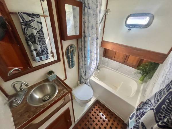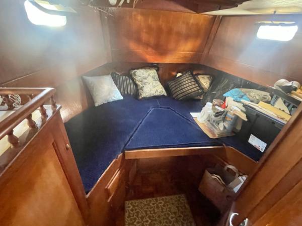 The interior has a large owners cabin with 7’ berth double lots of cloth storage in two hanging lockers, several draws and a desk along with a very large head area and full bathtub shower, head and sink.