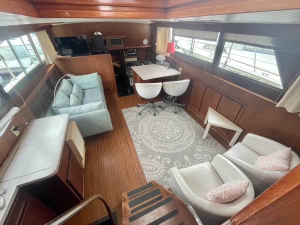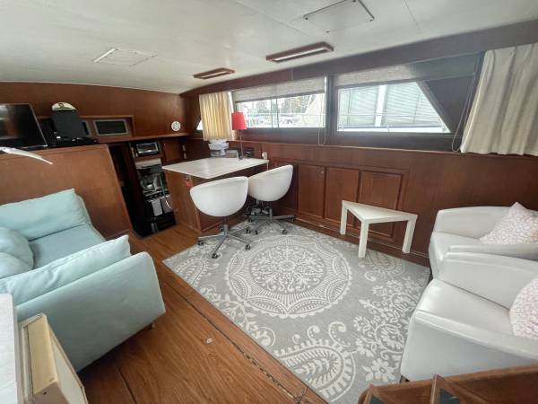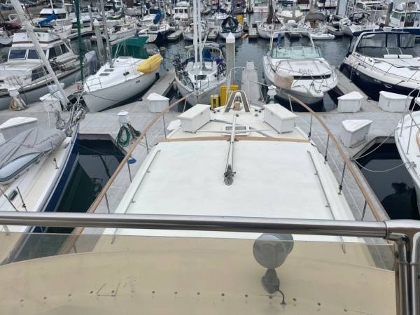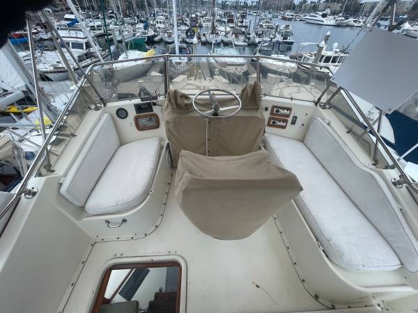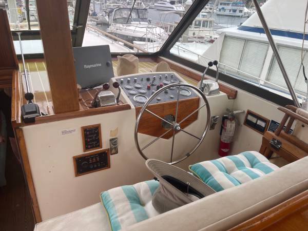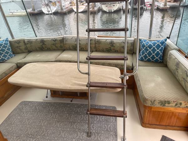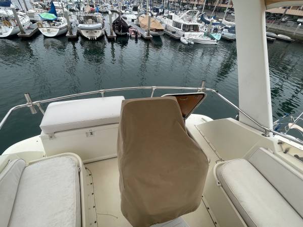 On deck helm and on flybridge with great visibility for entering and exiting the slip or mooring The large aft deck with built in seating and is fully enclosed.