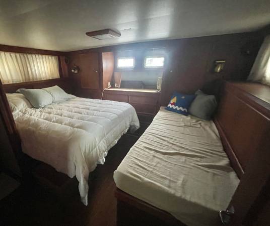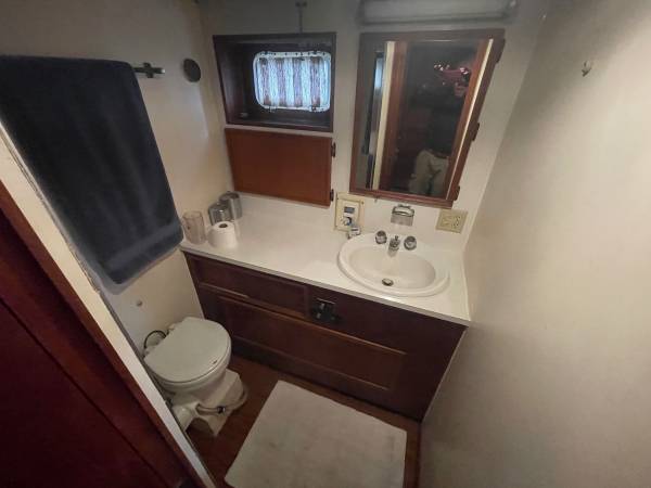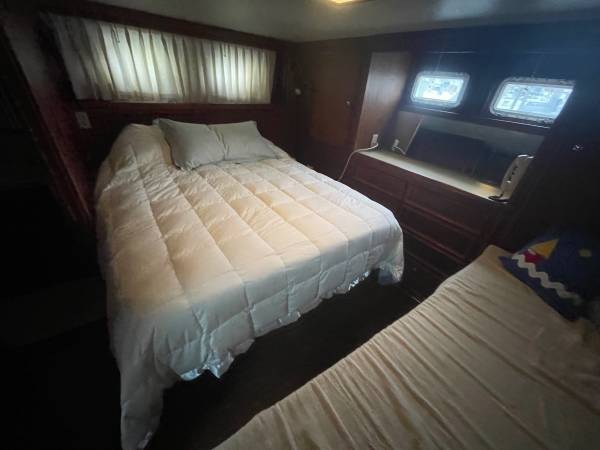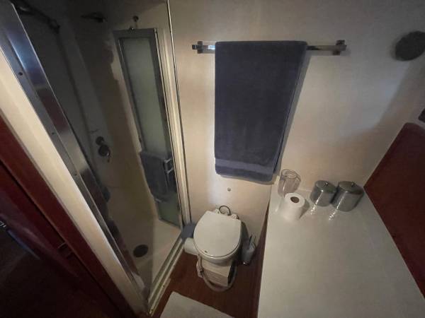 Aft is the master stateroom with queen berth snd two large closets with ensuite head with stall shower