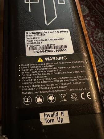 Rechargeable Li-ion Battery Electric Bike 36V 10.4Ah Model ZZ631004 With Charger. Works great . If interested text me at