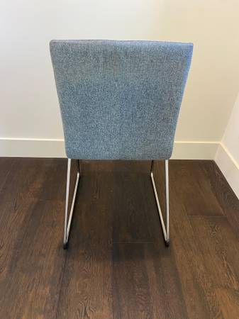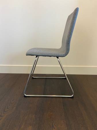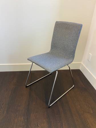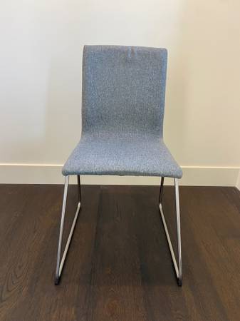 Grey desk chair with chrome legs. Great for a home office or last-minute Thanksgiving guest. No stains or tears. Like new. The padded seat is shaped to reduce pressure and the backrest has a relaxing flexy feel. Very comfortable. Smoke free and pet free home.