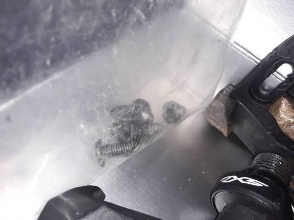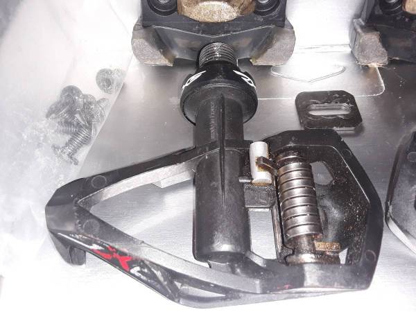 The pedals are used with plenty of scratches, but work perfectly. They come with cleats, all six screws, and a single base plate (*You'll need another...).