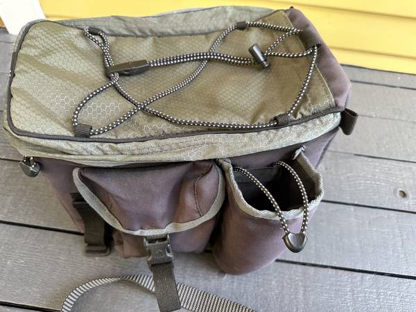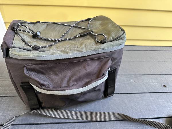 Great combination bag fits on almost any rack front or rear, or can be slung over your shoulder (included strap is a bit short for crossbody) Padded, can keep cool things cool, about 6 by 12 by 7 high nominally 10 liters, with bottle pocket and a snap-closed pocket and a zip-closed pocket on the outside. The waterproof pack cover (bright yellow) is included in its own little pouch inside the main compartment. Stretchy bungee cords on top of bag let you fasten bulkier objects. Four strong velcro straps attach it to your rack. Easy to release as you take the bag into the office. Current model street/web price $58.