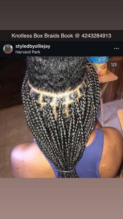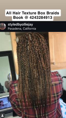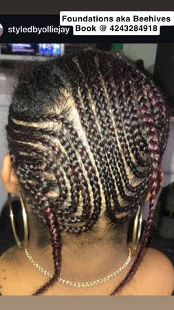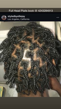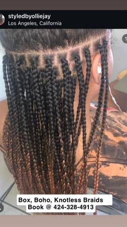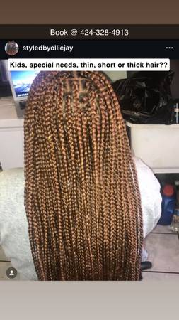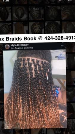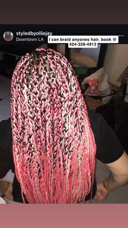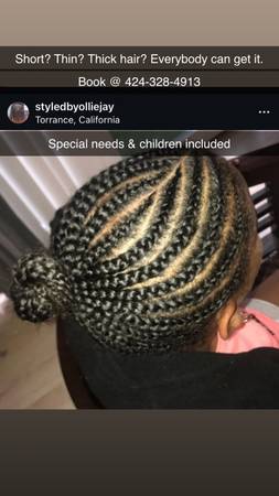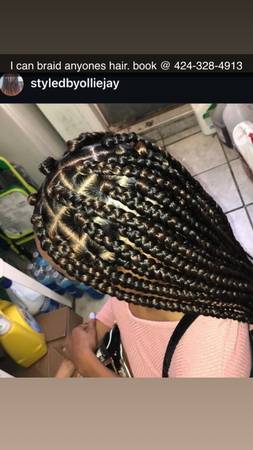 The fastest braider in SoCal. I have 20 years of braiding experience with men (with designs), women, and children *disabilities included*. French braids, crochet beehives, regular beehives, 2-3 layers, starter locs, two strand twist, retwist locs, feed-in or box braids 4243284913. All ethnicities included. Please do not waste my time. GOD Bless. @styledbyolliejay on IG