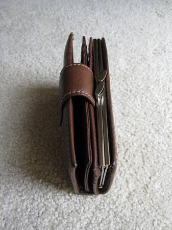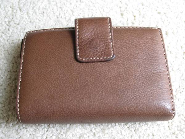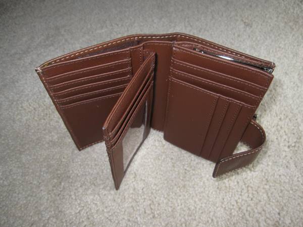 Brand new brown colored leather wallet with tons of storage for cards (20+ can fit). Also includes window for ID holder and larger pouch for cash. Measures 5.25" x 3.75" and just over 1" in depth....