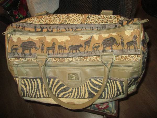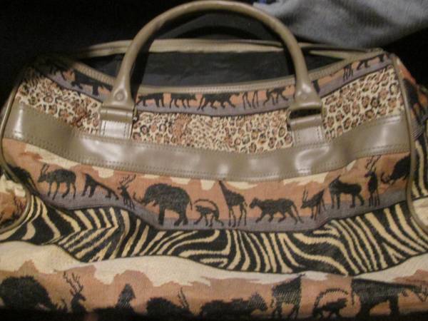 Large duffel bag with safari animal print and multiple zippers. 19" long x 10" deep. This is a great travel or overnight bag! Super pretty print!