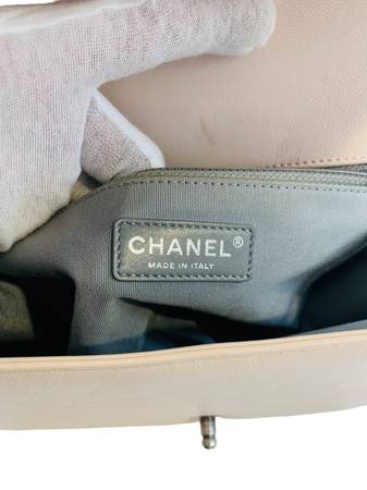Description: This beautiful Chanel Beige Boy Bag is in good condition, showcasing a natural patina on the exterior. The bag features some scratches and scuffs on the edges and corners, along with minor peeling and cracking on the front flap near the hardware lock and on the back. The interior has a small red ink mark, as shown in the last photo, but is otherwise in good condition with normal signs of use. With a minor restoration, this bag can look like new again.