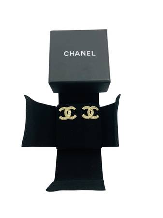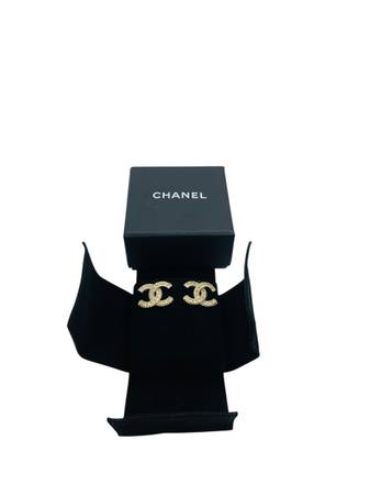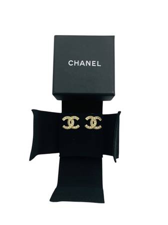 Description: These pre-owned Chanel Gold-Tone Interlocking CC Stud Earrings feature classic crystal detailing and are in good condition with light signs of wear. A timeless piece of luxury, they come with the original Chanel box and pouch. Other accessories are not included. The earrings' size is approximately 21 mm x 15 mm.