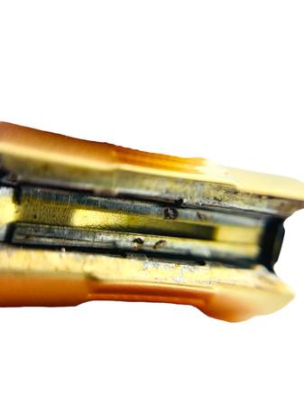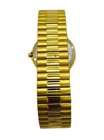 Description: Disney 24 Year Cast Member Retirement Watch "Golden Ears" – Pre-owned. This gold-colored watch with a two-tone band (gold on the outside, silver on the inside) was awarded to Disney Cast Members upon retirement, this one in particular was after 24 years of service. The watch face features Mickey Mouse passing down the golden "ears" in a symbolic gesture. The case back is engraved with the cast member's initials and years of service, and shows some scratches from wear. One link has a red dot on the gold side, and several links show typical signs of use in the crevices. The watch is in working condition with a fresh battery. Watch only – no box or papers. A rare and sentimental collectible for Disney fans.