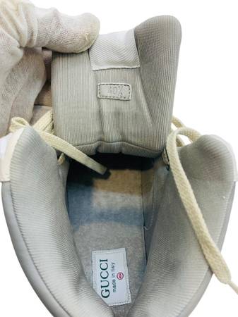 Description: For sale, we have a pair of Gucci 765437 Interlocking G High-Cut Distressed Effect Sneakers, size 40 1/2 (equivalent to U.S. Men’s size 7). These sneakers are new/open box and have only been tried on — they have never been worn outdoors or used. The sneakers feature Gucci’s signature Interlocking G design with a stylish distressed finish, offering a luxury streetwear look that stands out.