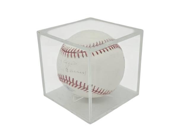 Description: MLB Don Larsen & Yogi Berra Signed Baseball with Certificate – Pre-owned. This collectible baseball commemorates Don Larsen's perfect game in the 1956 World Series and the ceremonial first pitch at Yankee Stadium on 11/9/02. The ball is in overall good condition (8/10), with some minor dirt possibly from handling. The signatures of Don Larsen and Yogi Berra are present but not very bold, as the ink appears slightly faded. The ball is a Rawlings official MLB ball and comes with a certificate of authenticity from BC Sports Collectibles. The case is included but shows some scratches. A rare and historic piece for baseball collectors.