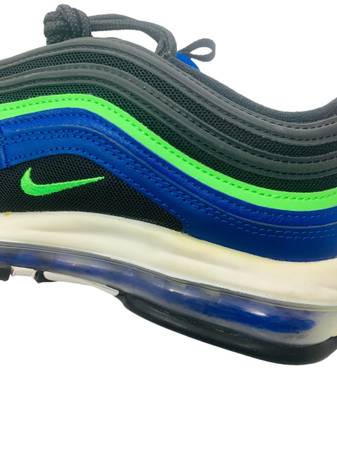 Description: These Nike Air Max 97 sneakers in Royal Blue Neon, size 10, are in great condition. They show signs of use, with a minor yellow tint around the top area of the sole, but overall look wonderful. See photos for more details.