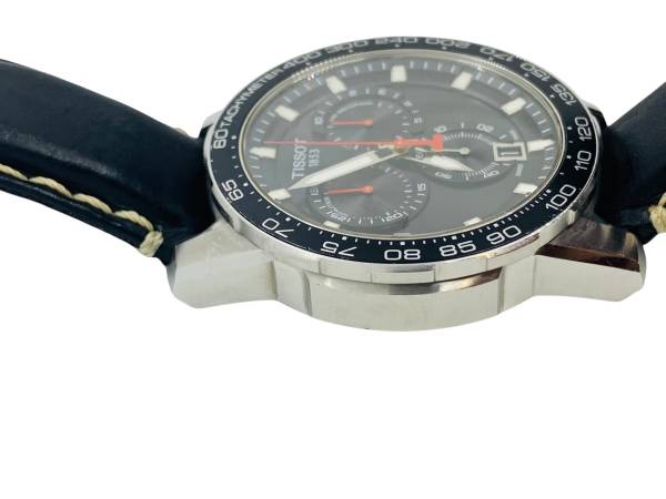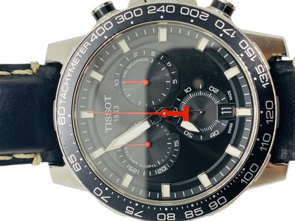 Description: For sale, we have a Tissot Supersport Chrono Black Dial Black Strap Men’s Watch T125617A. This pre-owned quartz watch is ticking well and shows normal signs of prior use. The case has light hairline scratches, and the leather strap shows some peeling along the leather side areas as well as typical creasing.