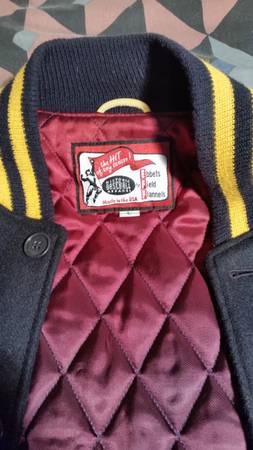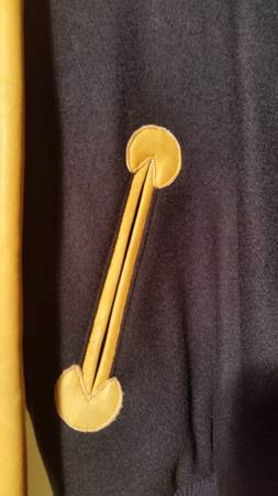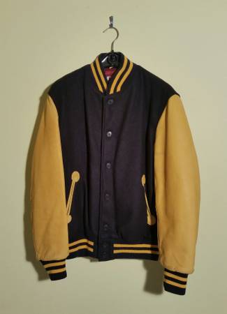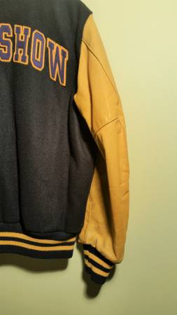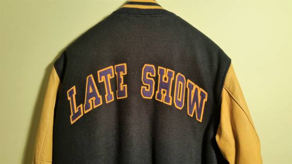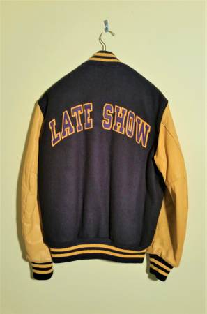 Authentic David Letterman "LATE SHOW" Varsity Jacket. Made in U.S.A. by Ebbets Field Flannels, Historic Baseball Apparel. Size is Large. Mustard Yellow Color Leather Arms and Leather Piping Trim Detail on Pockets. Dark Blue/ Almost Black Color Wool Body and Has Knit Collar and Cuffs and Waist. Large Felt "LATE SHOW" Letters, Blue Color with Yellow Outline Color, sewed on Back of Jacket. Quilted Nylon Lining. This is The Real Deal From His Actual Show. 2013-2014. Given As Gifts to High Profile Celebrities such as Bruce Willis and Others. Condition is Excellent, Like New. The actual color is much nicer when you see it in person. No Tears, Stains, Smells, or Damage. This is a Really Beautiful, Well Made Coat that is a Part of Television History. Call Ken at show contact info