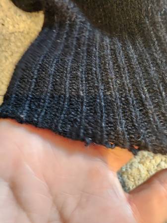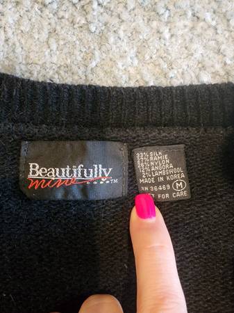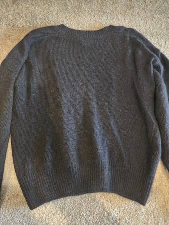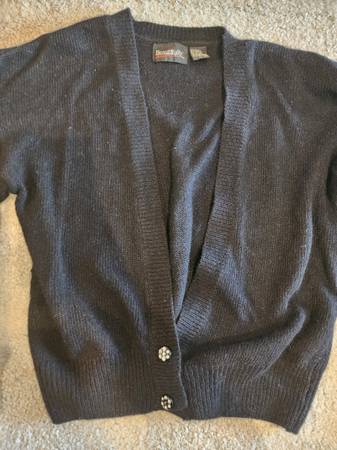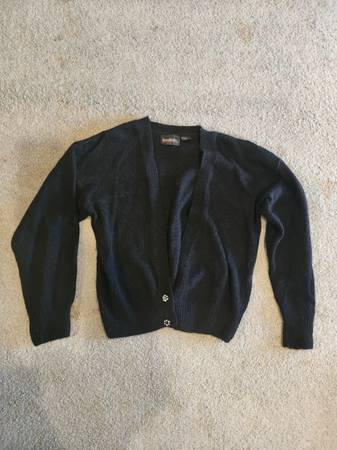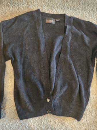 Black Cardigan with Rhinestone Buttons Size Medium. No flaws, rips, or stains. One sleeve the stitching is loose. Made of 33% silk. Two super buttons and low cut v-neckline. Measures 21 in long and...