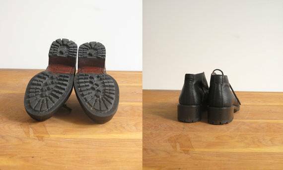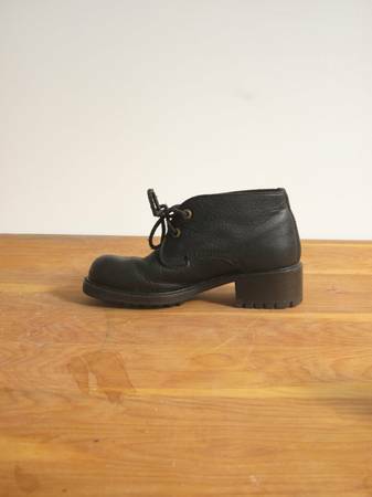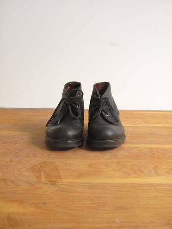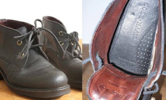 They're in excellent condition and the soles are hardly worn. These are high-quality leather Cole Haan boots. The interior is brown leather lined with a black leather footbed. The exterior is black leather, with leather laces and brass grommets.