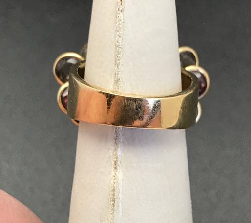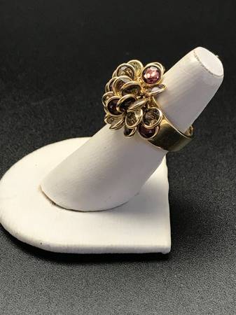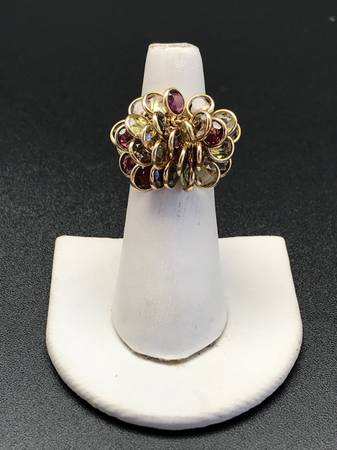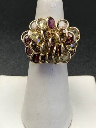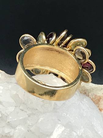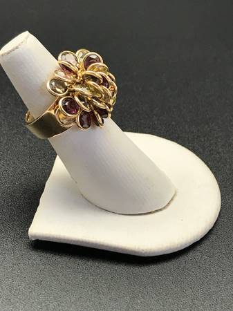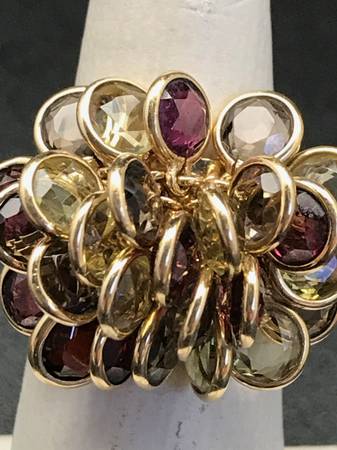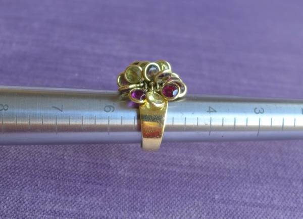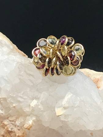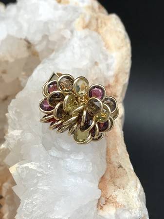 Gold and many tourmalines in a pom pom style of ring. This ring has a small sizer in it that I'm having a hard time removing without a jeweler's help. I was told it was easy and it was on other rings so I didn't have him bother. The reason I mention this is I'm not sure if this is 14K or 18K to read the hallmark inside. So far my mom's other rings were 18K but again, I'm not sure as this is from my mother's estate.