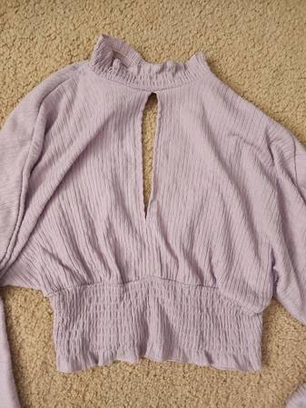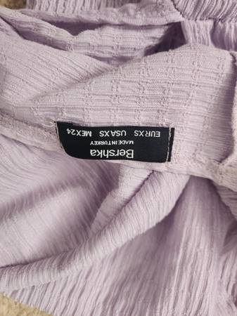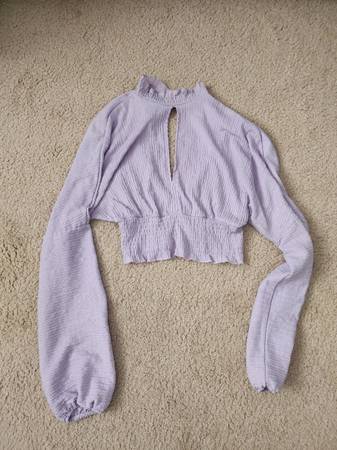 Lavender Bershka Long Sleeve Crop Top Size XS. Features turtleneck design with button closures behind the neck, keyhole design in the front, elastic waist and sleeves, and keyhole design in the back. No major flaws, rips, or stains. Very minor discoloration on the inside of the neck and chest area. Signs of wear or not noticeable when garment is on. Measures 17 in long x 13 in across and sleeves measures 28 in long.