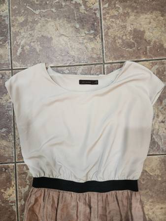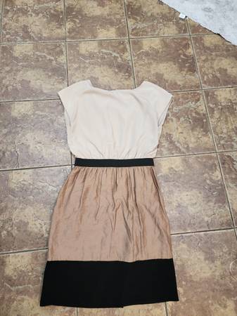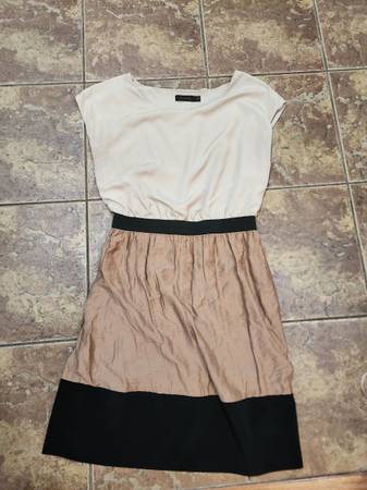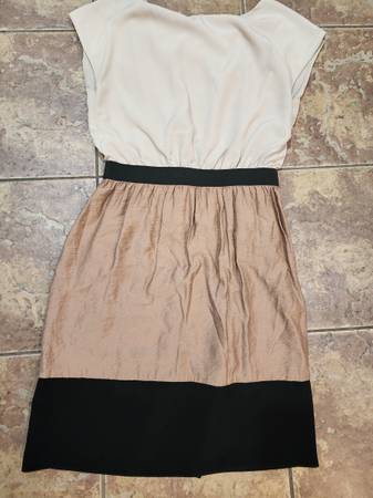 Like New The Limited Color Block Dress Size Medium. No flaws, rips, or stains. Flattering silhouette. Cap sleeves and scoop neck. Neutral colors of cream, teracota, and black. Measures 36.5 in long and waist measures and waistband ,measures 14 in however it is elastic and stretches. There is some slight marbling in the fabric near the armpits. Not sure if it just needs to be ironed because its on both sides.