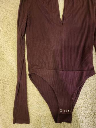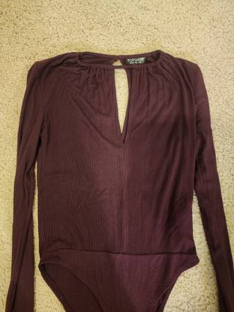 Like New Topshop Maroon Ribbed Bodysuit Size 2. Snap closure, keyhole neck and back, and back button. No flaws, rips, or stains. Measures 25 in long x 12 in across.