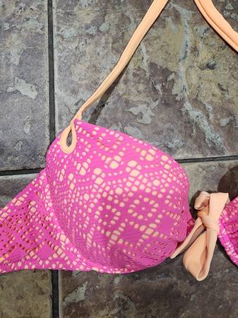 Like New Victoria's Secret Push up Swim Bikini Top 34D. In perfect condition, no flaws. Size tag has been removed but it is a size 34D. Originally $50. Colors: neon pink and orange. Has 3 size options for the back closure and ties behind the neck. Fully padded and pushes up for a flattering look. Cute bow detail in the center.