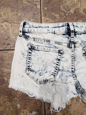 Low Rise Acid Wash Distressed Jean Shorts Size M. Brand: Sneak Peek. Very soft stretchy material: made of cotton, rayon, and spandex. Front zipper fly and button closure, 2 front pockets, belt loops, and 2 back pockets. No flaws or stains. All distressing is original to the style. Measures in 10 long and 15 inches wide when laying flat. Has a 2 in inseam. Only selling because I haven't worn these in a long time.