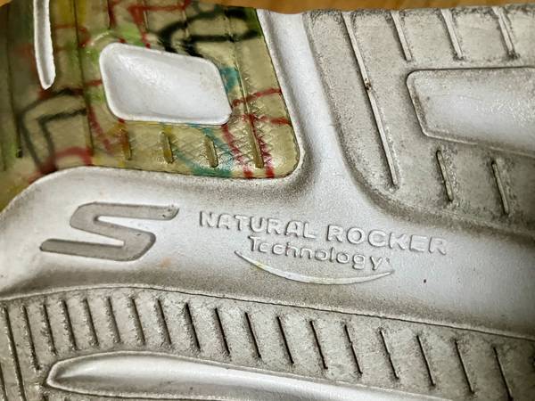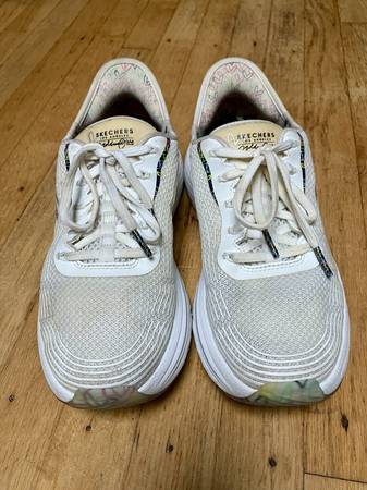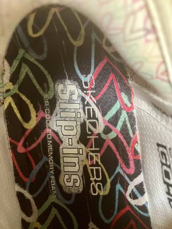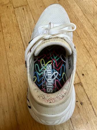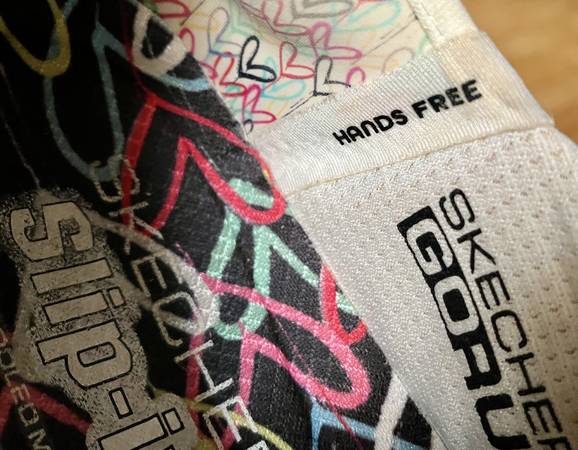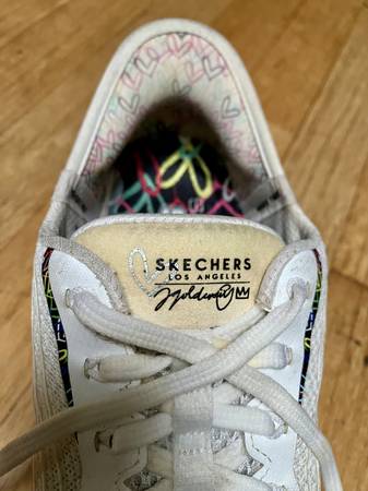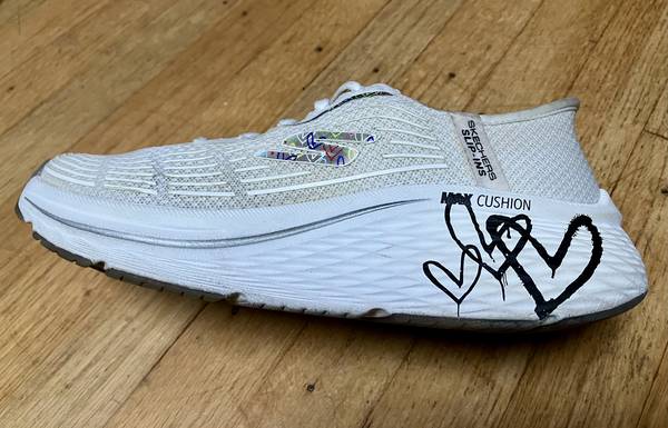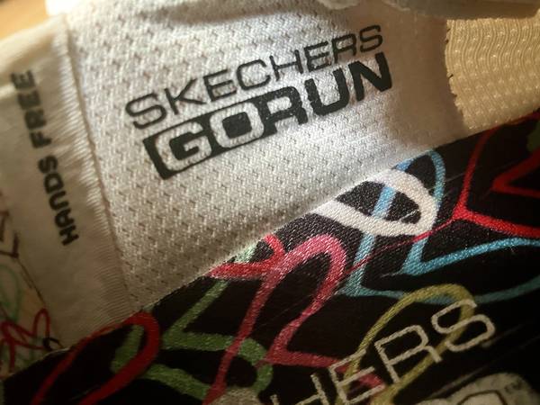 Skechers Los Angeles James Goldcrown GoRun Hands Free Slip-Ins with Air Cooled Memory Foam, Max Cushion, Natural Rocker Technology. Internationally renowned muralist James Goldcrown brings his iconic Love Wall heart design to the Skechers. Goldcrown’s signature heart patterns invokes hope and harmony. Clean, cool, and super comfy, size 7.5.