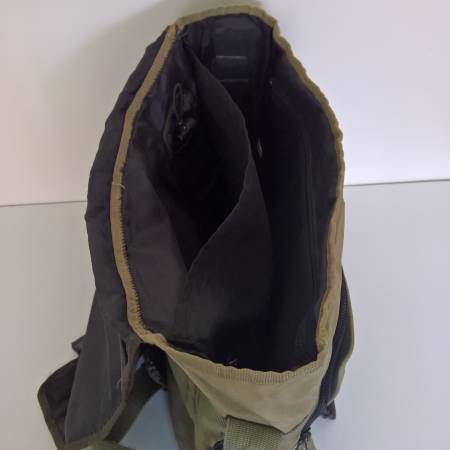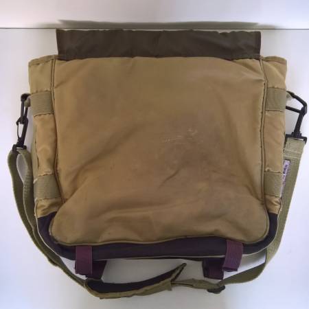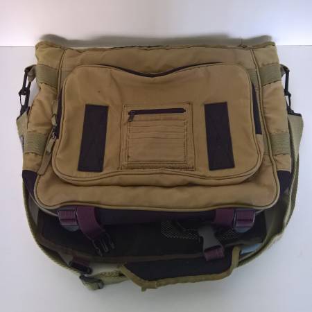 Used - Triple Five Soul | Triple 5 Soul Unisex Messenger Laptop Shoulder Bag. This nylon urban utility bag has four zippers with pockets, a cell phone pocket, internal divider and velcro strips with two latching clips. It also has an adjustable shoulder strap with clips. One side of the stitching on the long strip of velcro needs to be restitched or sewn. There is also a dark stain inside the lower right corner of one of the pockets. Please see pics for condition. Item is sold as is. Dimensions are approximately 17" length, 13-15" height, 3" wide.