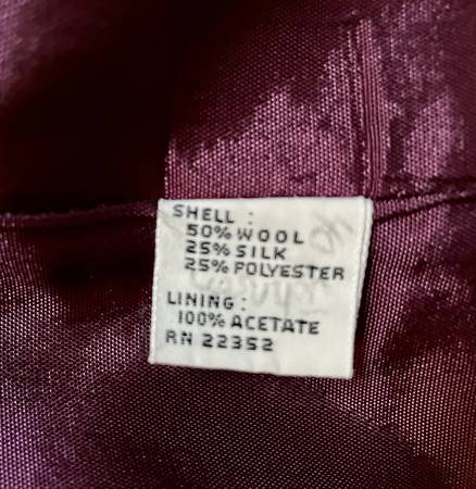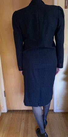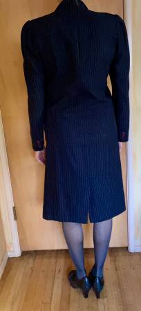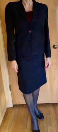 Warm 2-Piece Lined Wool Striped Skirt Suit, Size XS. Made in the Philippines by S.B. II. Label says Size 5, fits like a XS. Dark blue with light colored stripes, two front pockets in skirt and two pockets in jacket.