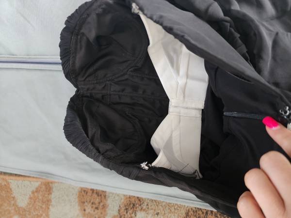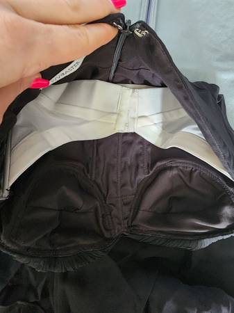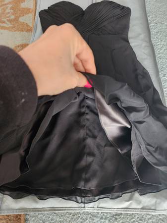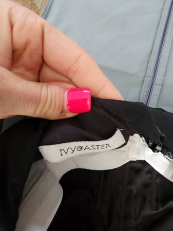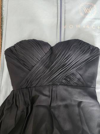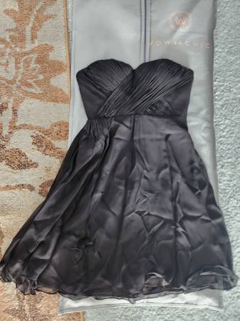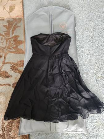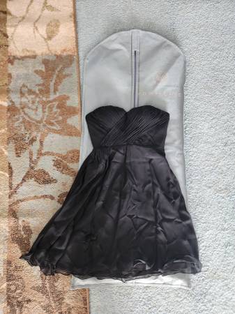 Worn Once Black Chiffon Dress Size 2. Brand: Ivy and Aster. Will throw in the garment bag, Has a build in bra so there is no need for one. Back zipper and eye hook closure. Fabric is chiffon with a sweetheart neckline. Double lined underneath. Needs to be ironed but no other flaws. Size tag was removed but will fit a size 2-4. Empire waist is very flattering. Measures 28 in long and waist is 13 in wide laying flat. Elegant design and color goes with everything. Worn once for a wedding. Paid $200 for it.