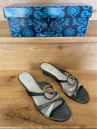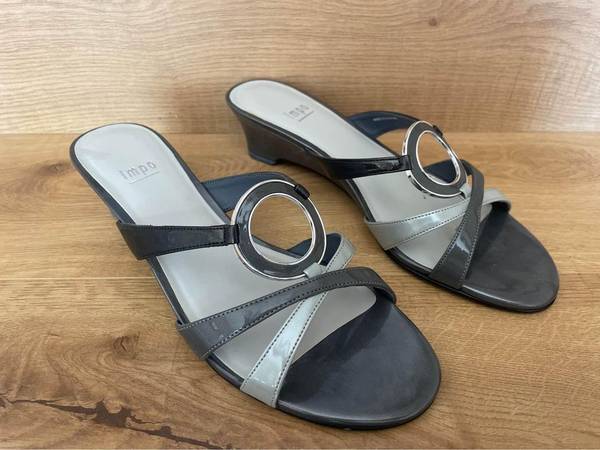 These Impo shows, size 8M, have never been worn. Featuring shades of grey with a chrome accent ring, they’re a nice accent to any outfit. There is slight shelf wear if left shoe foot lining but not...