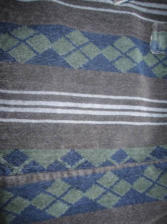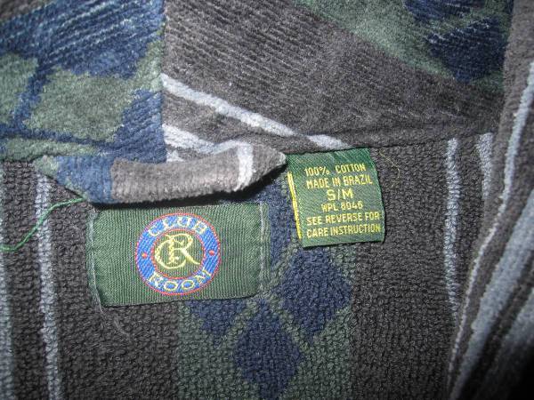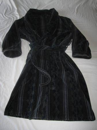 This is a men's robe by Club Room. It is in excellent condition and features a masculine pattern with the colors black, green and blue. The size is "Small/Medium".