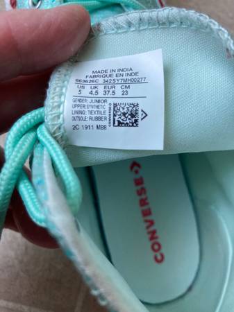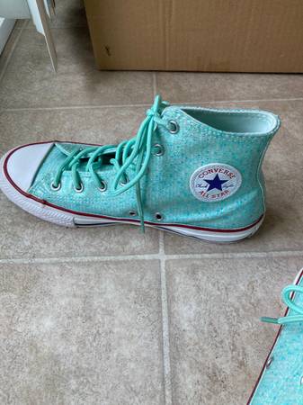 Converse All Star High Tops Light Sparkly Turquoise & Black and White Lightly worn. Looks like new. I wear Women size 5 to 6. Check the centimeter sizes. $20 each or both for $30 (will not sell...