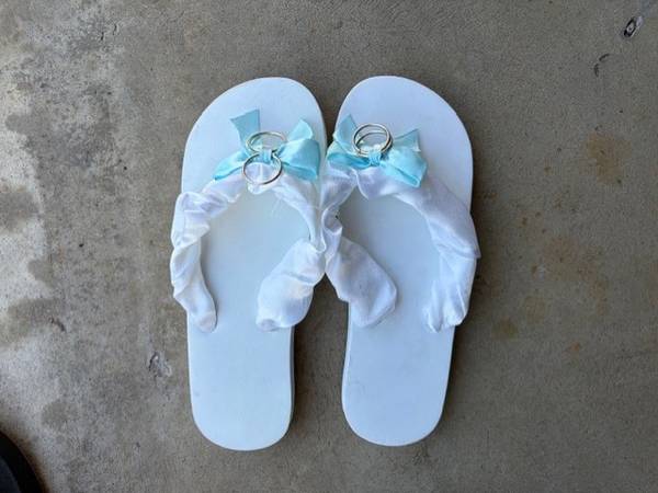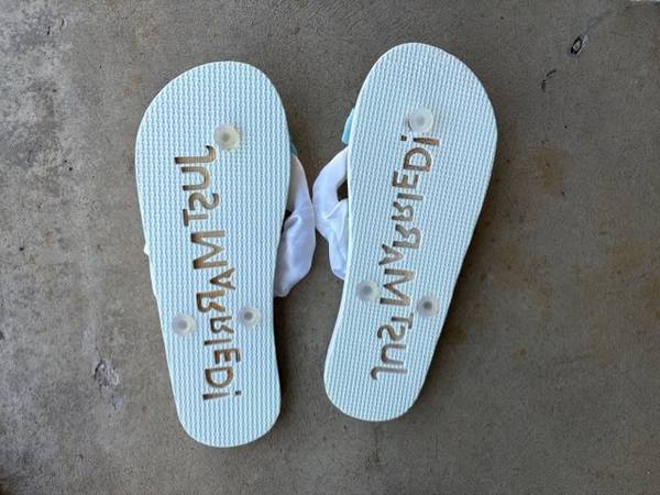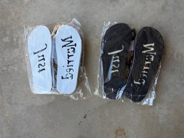 Victoria Lynn His & Hers Just Married Flip Flops - 3 Pairs - Brand New - Women and Men. 3 pairs. $20 White with Blue Bow Size 6 White Women In Plastic Size 7-8 Black Men In Plastic Size 11-12