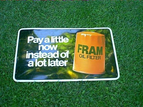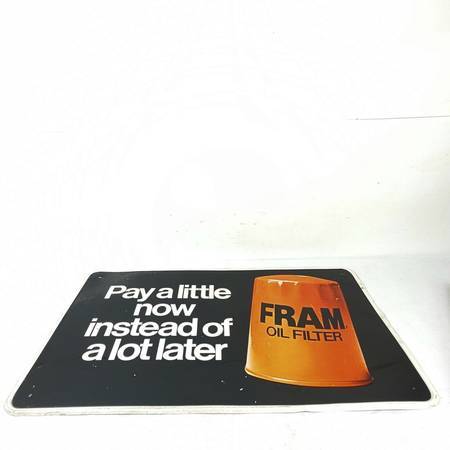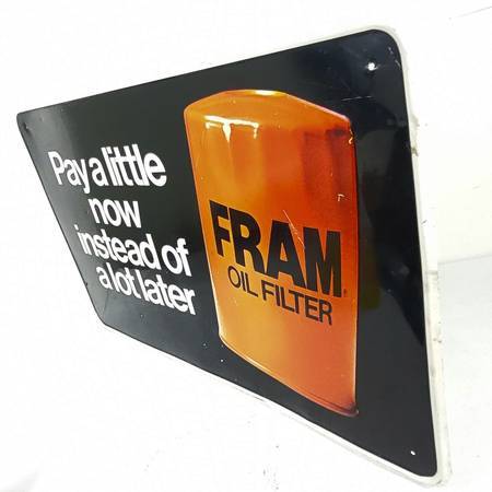 Fresh from my inventory tonight we have for sale a RARE & ORIGINAL EMBOSSED DEALERS SIGN FOR FRAM FILTERS STATING, PAY A LITTLE NOW OR A LOT LATER.....