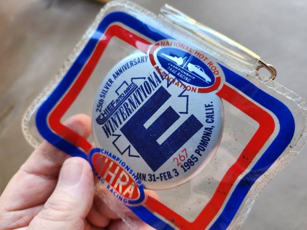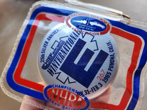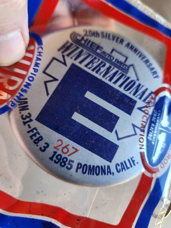 Price drop!!! Now at the lowest price Original BADGE for Championship NHRA Drag Racing meet in 1985 in Pomona California- WINTERNATIONALS "E" type badge #267- 25th Silver Anniversary meet.. Over 39...